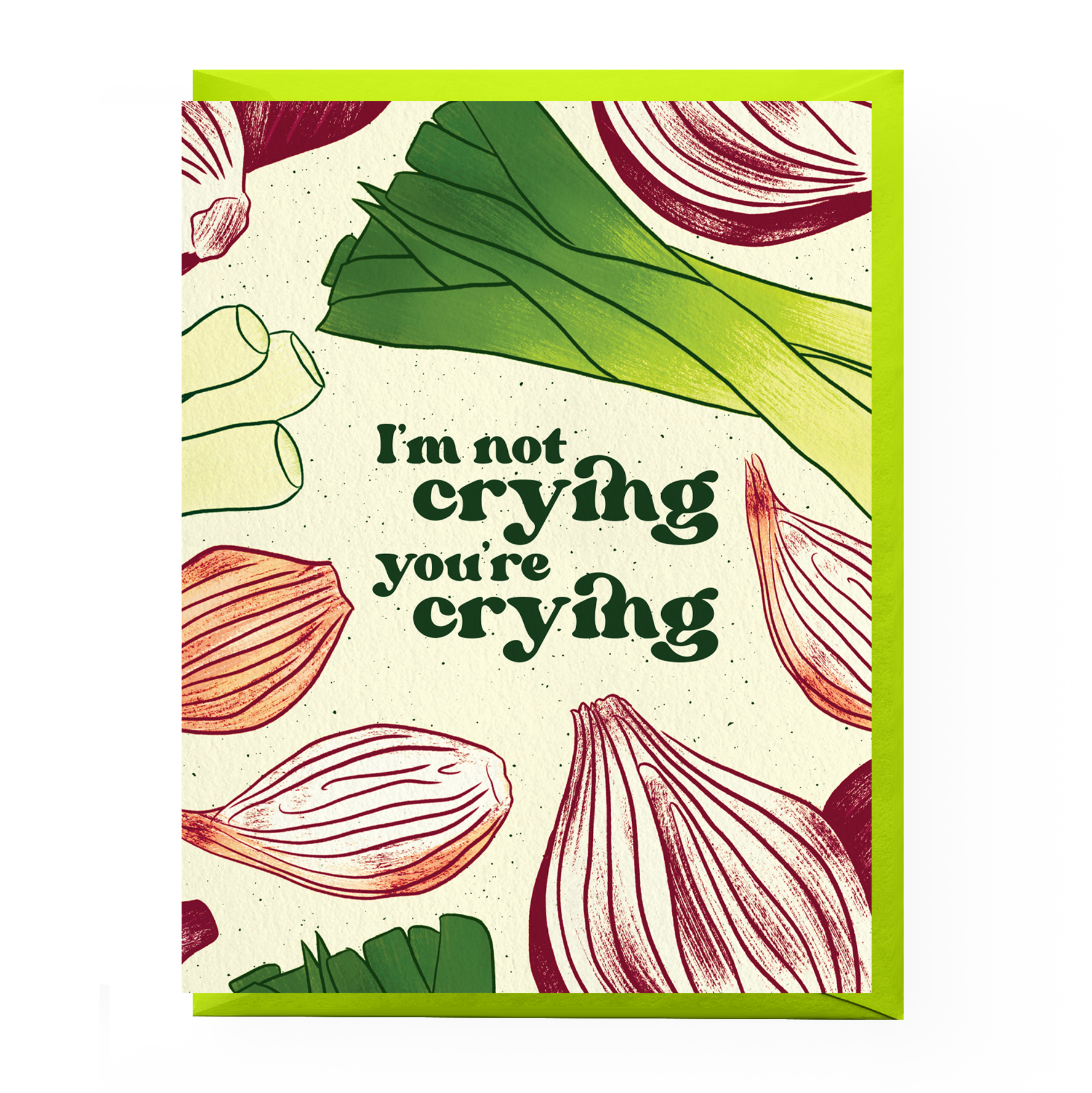 Card reads "I'm not crying, you're crying" and features illustrated leeks, onions and shallots in green, plum and peach.