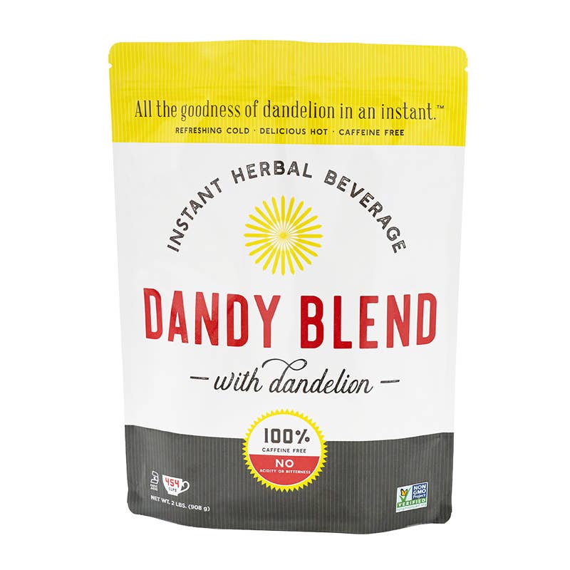 Dandy Blend is a caffeine-free herbal beverage and coffee alternative. It consists of four ingredients: roasted barley extracts, roasted rye extracts, roasted dandelion root extracts, and roasted chicory root extracts.
