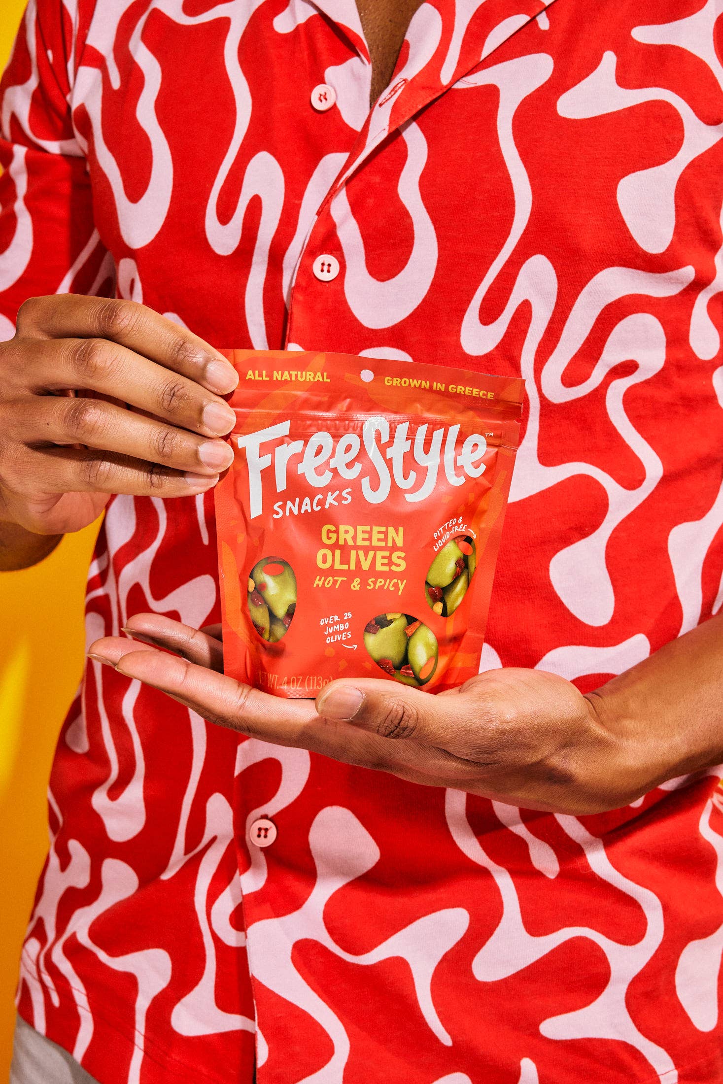 Freestyle Snacks green olives are harvested traditionally in Greece, bursting with fresh flavor. Marinated in extra virgin olive oil and our one-of-a-kind spicy Calabrian Chili blend, our Hot & Spicy olives pack a fiery kick.