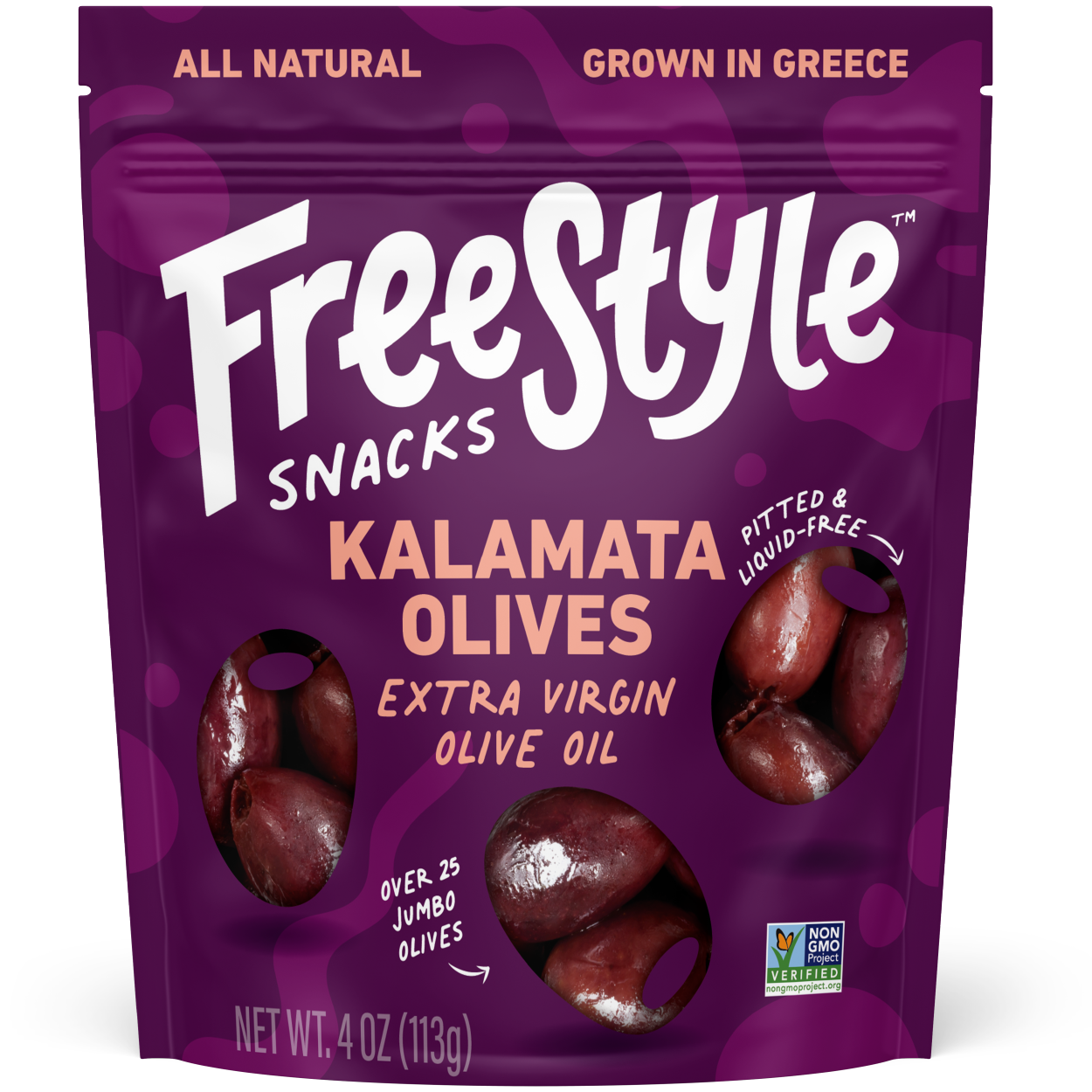 Freestyle Snacks Original Kalamata olives are grown in Greece and harvested when juicy. Marinated in extra virgin olive oil and a hint of sea salt, each of our olives brings an explosion of mouthwatering goodness.