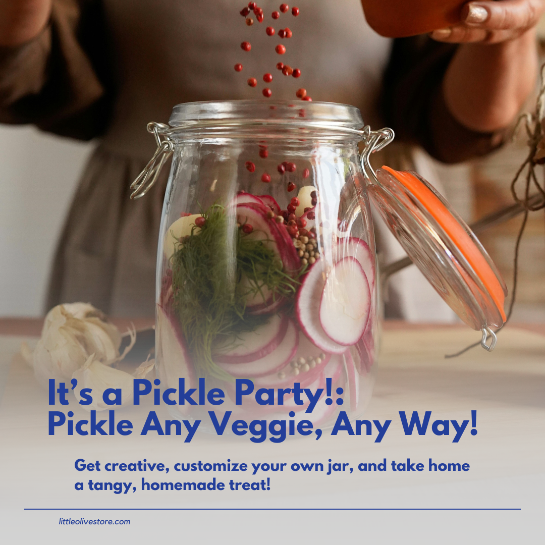 Love a good crunch? Join us for a hands-on pickle party celebrating the best of seasonal produce. We'll cover principles of vinegar-based pickling, how to incorporate it easily into your weekly routine, and why pickles are a bright, tasty addition to any salad, stew or stir fry. All participants will jar up some pickled goodies to take home for their friends and family. Snack: Asiago Cheese & Whipped Hummus topped with EVOO and Local Bread