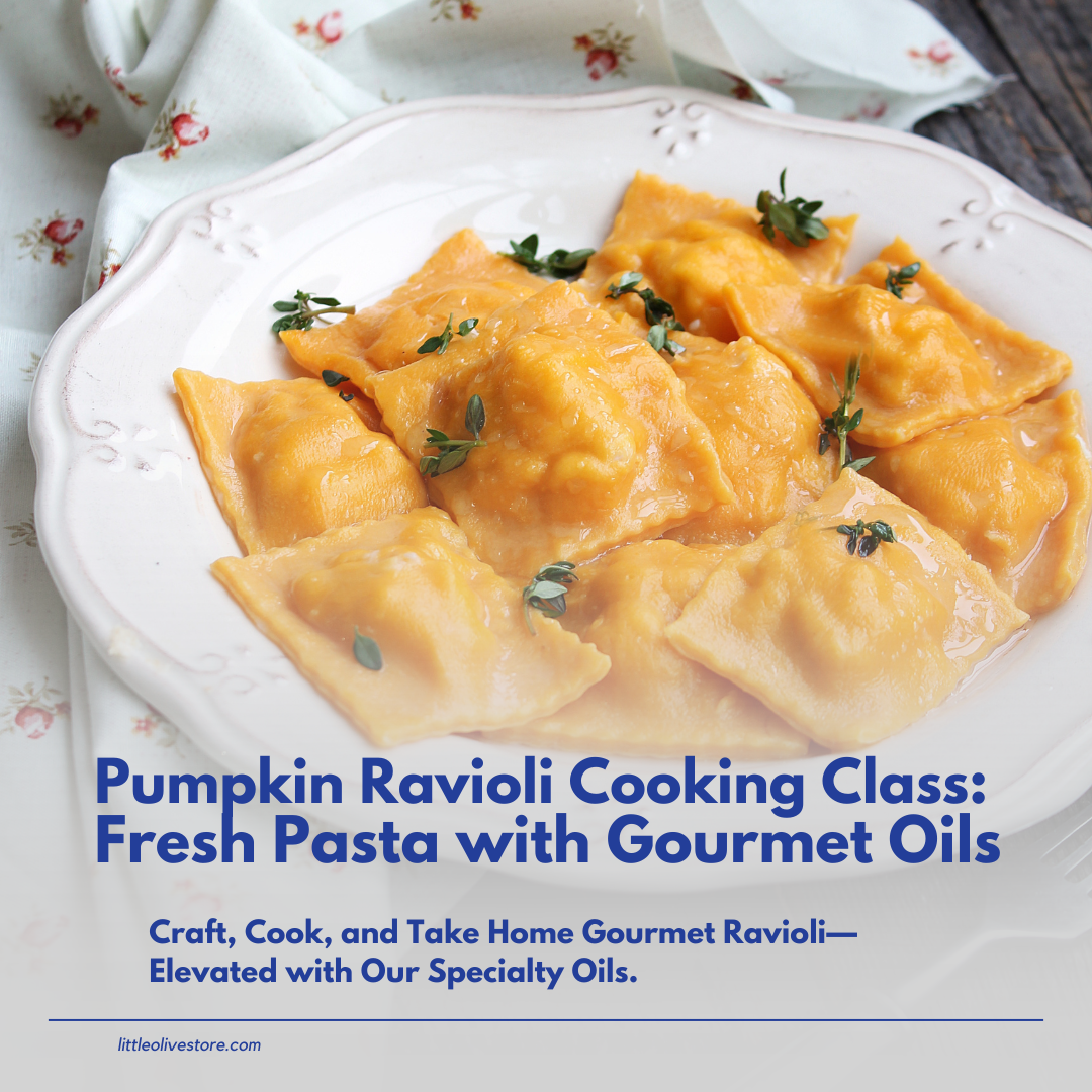 Master the art of homemade pumpkin ravioli in our hands-on class! Learn to create fresh pasta, a delicious filling, and a perfectly paired sauce using our premium oils and vinegars.